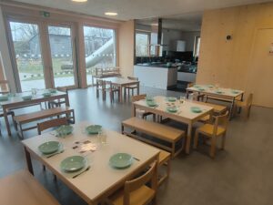 Neben unserem Turnraum ist unser Speisesaal untergebracht. Hier findet in zwei Gruppen das Mittagessen für die Nachmittagskinder statt. um 14.30 Uhr treffen sich alle Kinder dort für die gemeinsame Nachmittagsbrotzeit.