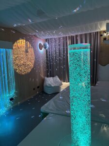 Im Erdgeschoss neben der Küche ist unser Snoezelenraum. Unter Snoezelen wird eine gestaltete Umgebung verstanden, in der durch steuerbare multisensorische Reize, Wohlbefinden ausgelöst werden soll.