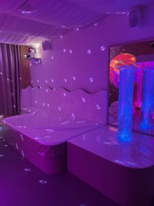 In diesem Raum finden gezielte Angebote in Kleingruppen oder Einzelförderung statt. Es gibt verschiedene Lichteffekte und ein musikgesteuertes Wasserbett.