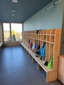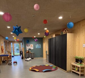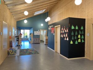 Immer zwei Gruppen teilen sich einen großen Gang vor den Gruppenräumen, der als erweiterter Gruppenraum Platz zum Spielen bietet. Dieser Spielbereich wird von Zeit zu Zeit mit verschiedenen Möglichkeiten gestaltet, je nach Bedürfnis der Kinder, z. B. Autoteppich, Leseecke. Kaufladen, Ponyhof, …. Jede Gruppe hat eine eigene Garderobe, in der die Kinder am eignen Platz ihre Kleidung, Turnbeutel und Wechselwäsche deponieren. In der Garderobe befindet sich auch eine Infotafel der jeweiligen Gruppe, auf der Sie wichtige Informationen, welche die Gruppe betreffen finden.