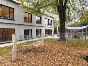 Unser Garten wurde 20024 im Zuge des Neubaus neu gestaltet. Er bietet den Kindern Klettermöglichkeiten, Pflasterflächen für Fahrzeuge, Sandkasten zum Buddeln und Bauen, Bäume und Sträucher für Rückzugsmöglichkeiten, Rutschen, Schaukeln, eine Fußballwiese, eine Matschanlage für den Sommer und einen Schlittenberg für den Winter. Umrandet wird unser Garten von wunderschönen alten Bäumen, die uns jede Menge Naturschatten bieten.